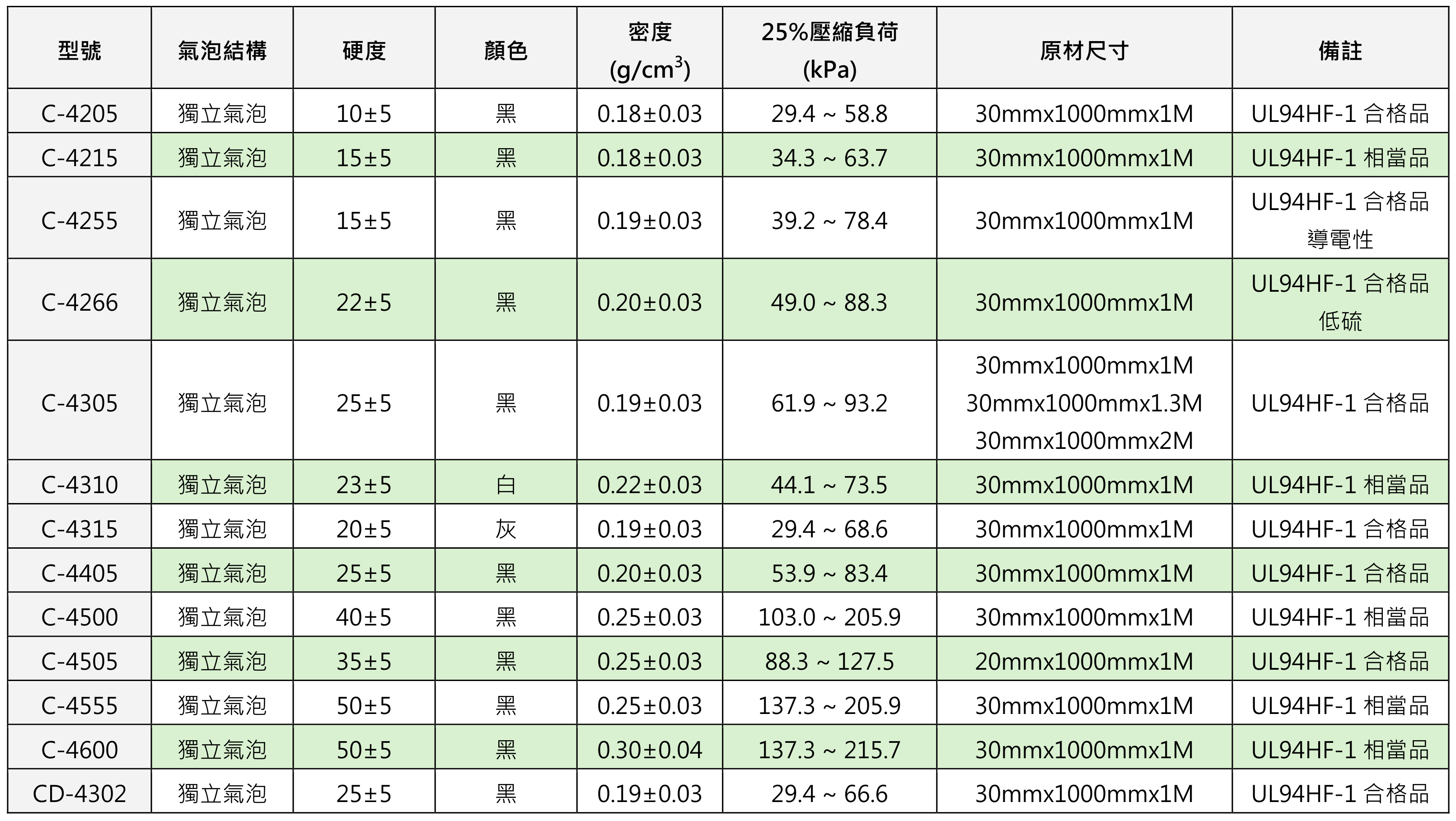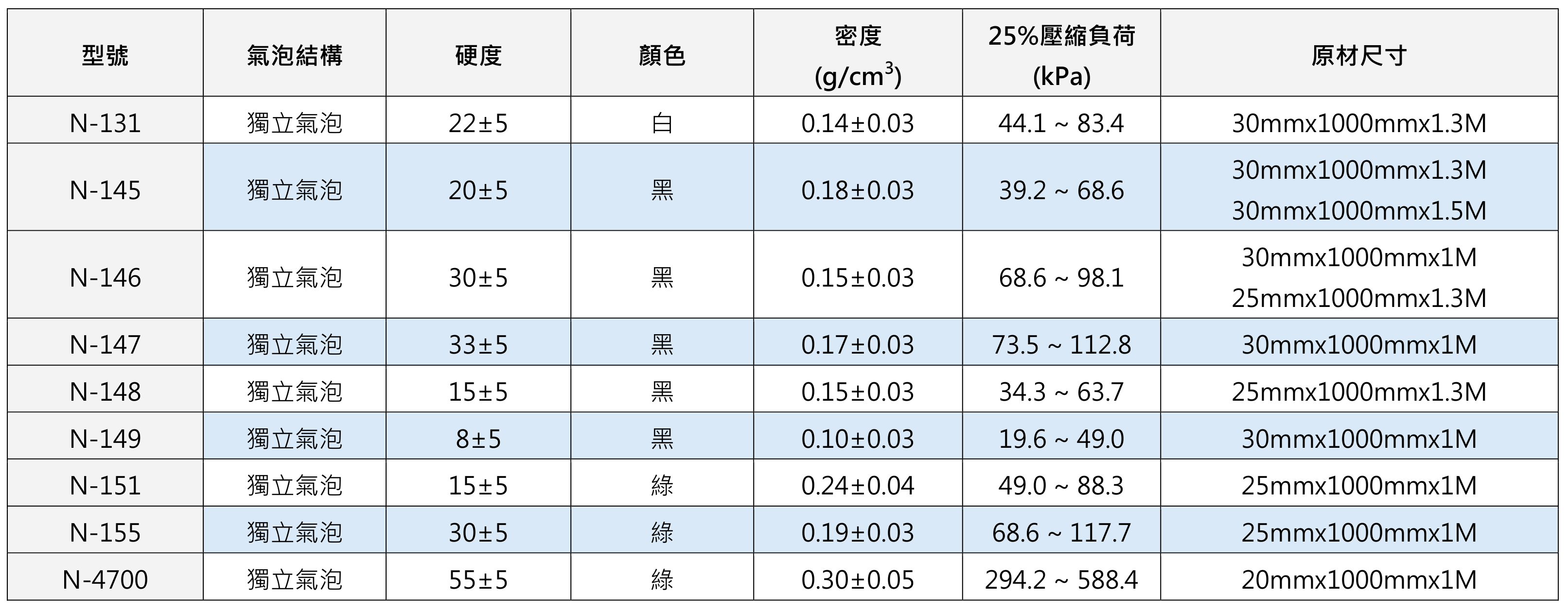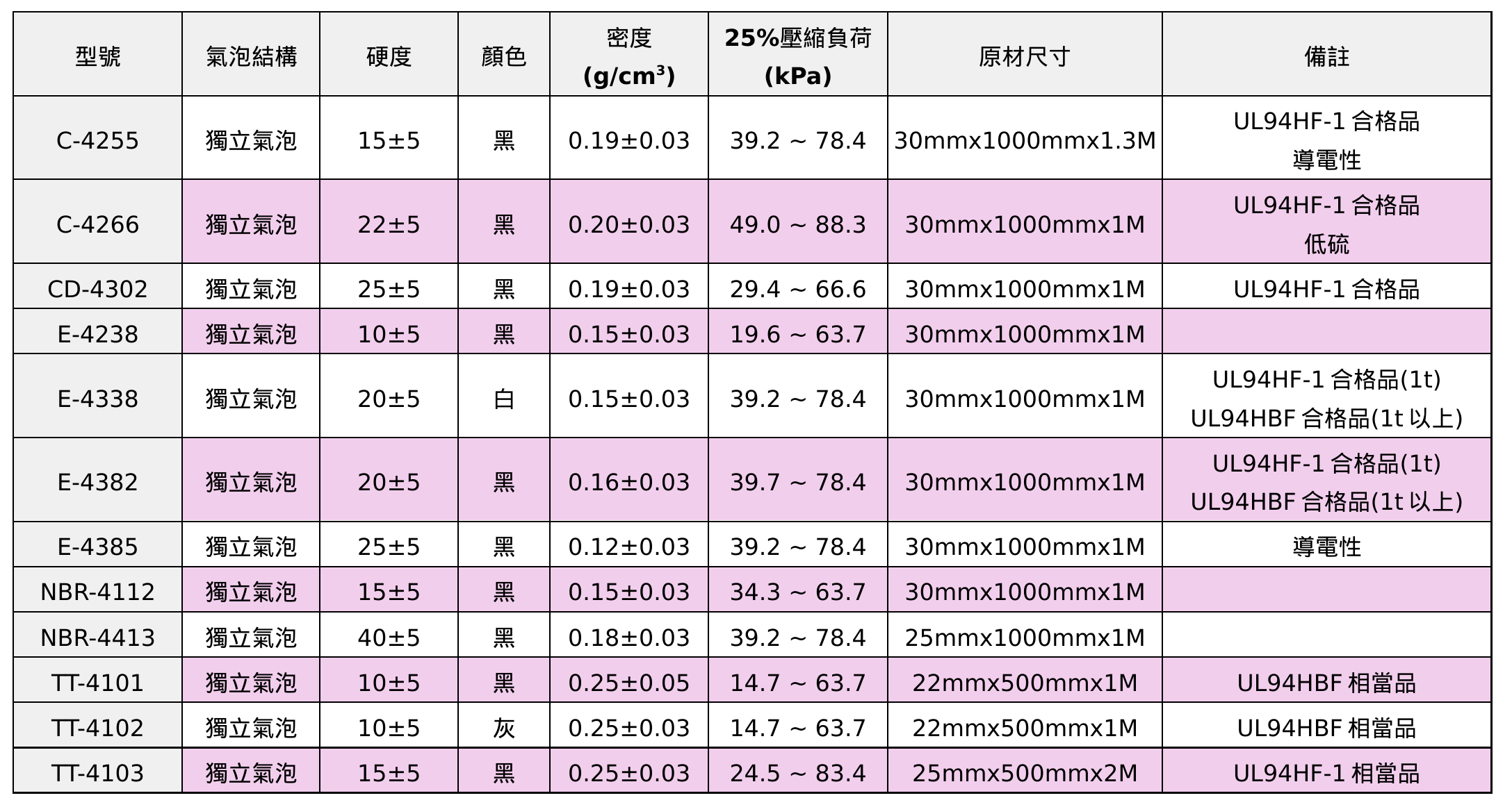獨立氣泡發泡體(泡沫板):將橡膠材料(NR系、CR系、EPDM系)作3~10倍發泡製成之發泡體、可以提供多種硬度及橡膠材料,且有具阻燃性或耐候性的特殊規格。主要提供黑色,也有白色和綠色的材料。