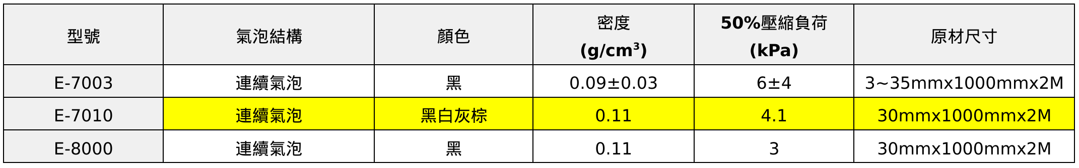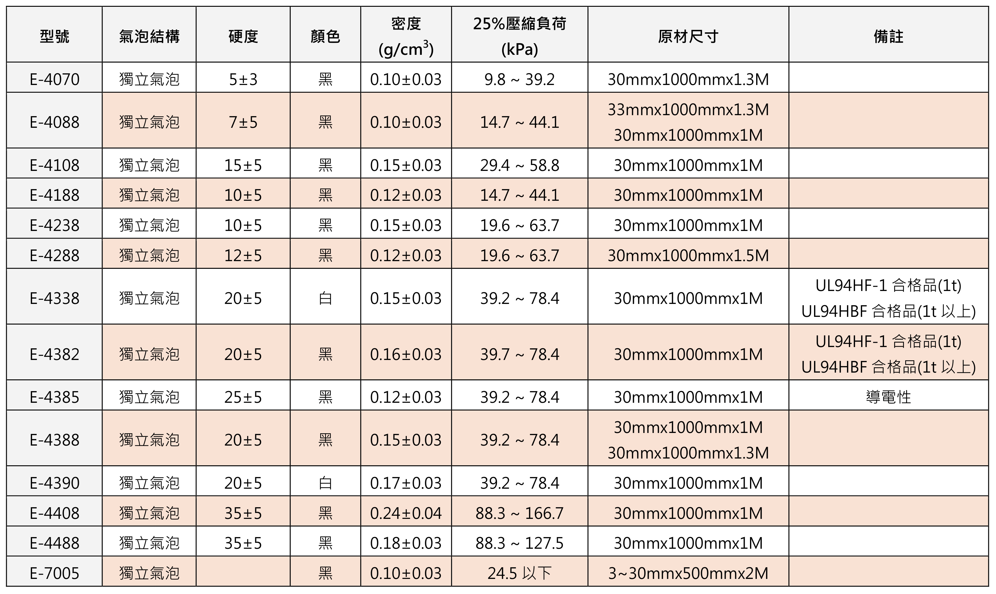特殊獨立氣泡發泡體(泡沬板):具有脫硫或導電等特殊機能的獨立發泡體或NBR系、矽膠等特殊材料發泡製成的產品。
