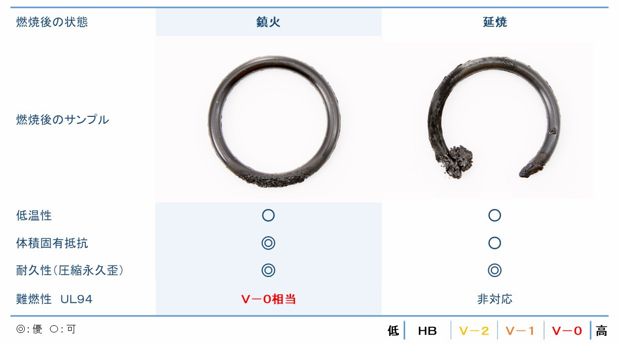 使用難燃性EPDM材料製造的難燃性O型圈在UL94標準(燃燒性評估標準)中符合V-0級別。同時,難燃性EPDM材料具有與一般EPDM材料相同的特性。