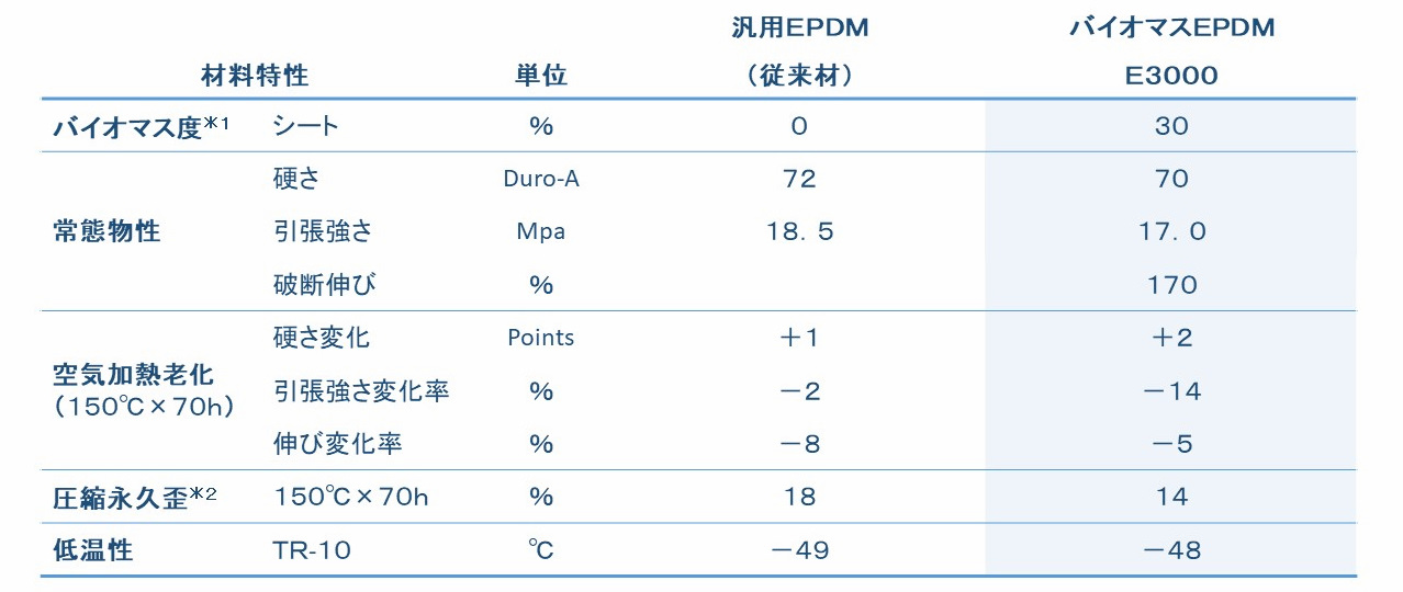 生物質EPDM材料【E3000】在EPDM材料中達到了30%的生物質成分,屬於環保材料。※EPDM:乙烯丙烯橡膠