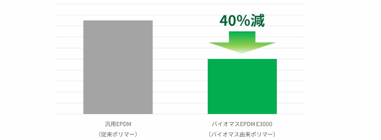 與傳統的汎用EPDM材料相比,生物質EPDM材料【E3000】在原料(聚合物)生產過程中可減少40%的CO2排放量。